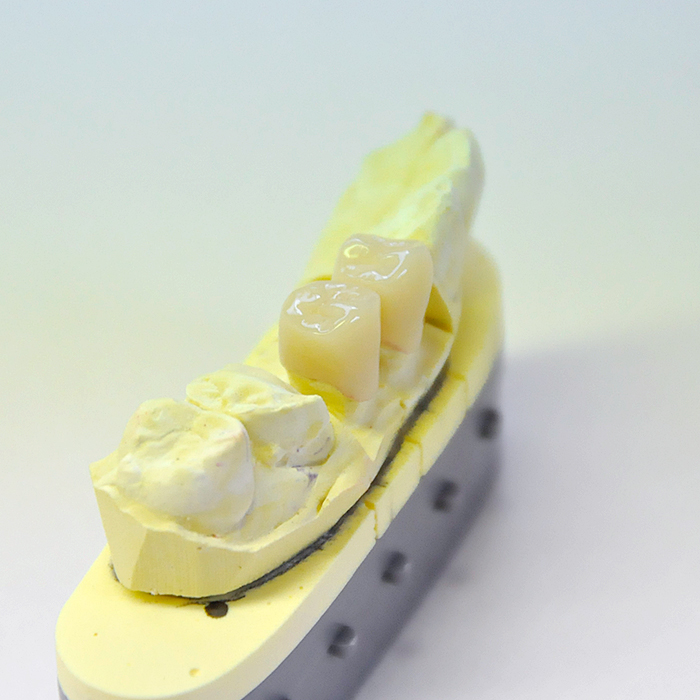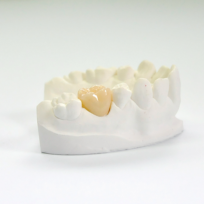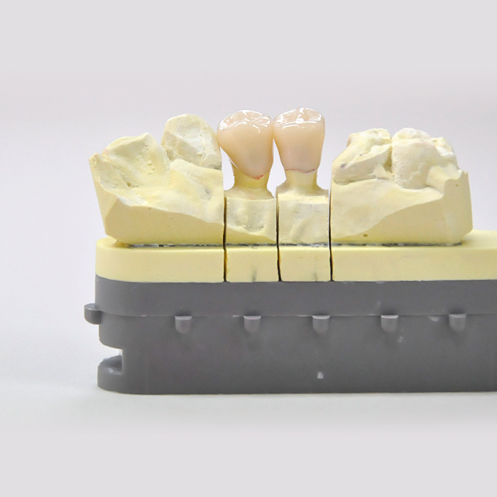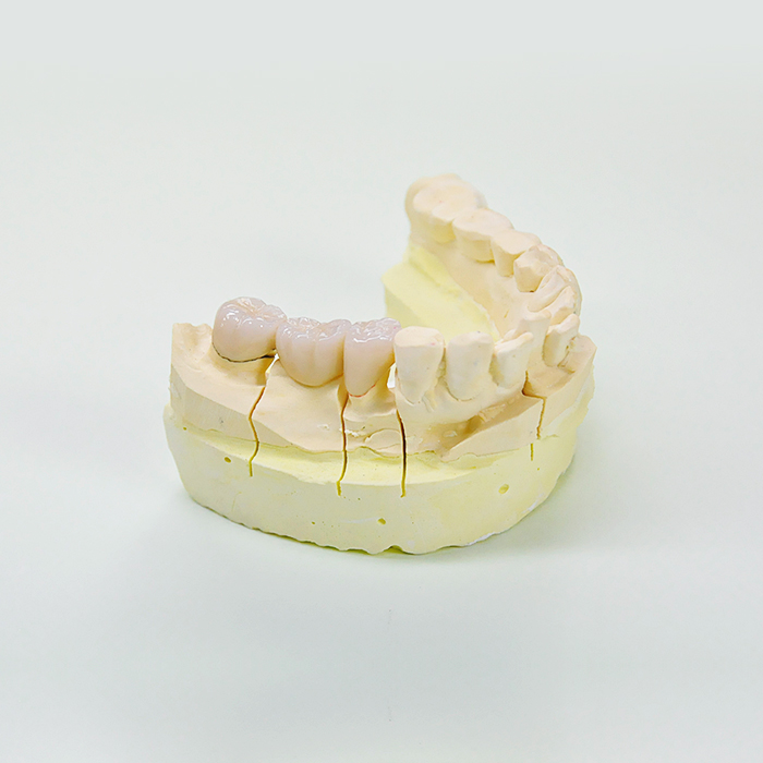 ジルコニアは今までのオールセラミックとは比較にならないほどの強度があり、臼歯のブリッジにも対応可能です。 ベースの色が4種類に分けられ、できた歯に色を付けていく(ステイニング)ことで天然の歯に近い風合いを出す方法ですが、歯ぎしりや咬む力の強い方の奥歯のオールセラミックの作成に向いています。